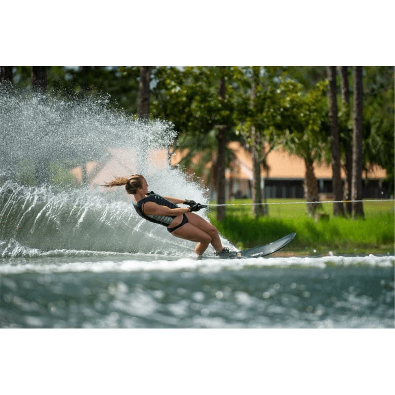 The OMNI waterski is optimized for the skier who needs one ski to do everything. Developed for high versatility with added responsiveness, the Carbon OMNI marries high performance aggressive skiing with the efficiency essential for open water skiing. Shape: The Omni was designed with a Hybrid Waist Width, halfway between those typically found in traditional skis and those in wideride skis. This provides for smooth instinctive turns at a wide range of speeds. The Omni’s Continuous Rockerline executes intuitive turns with no paralleling while the Clean Edge Technology tail reduces drag 50% by allowing water to release cleanly off the bottom of the ski. This differs from conventional edges where water wraps around the bevel, up the sidewall and releases off the upper edge creating suction. The Clean Edge bevel-less tail offered in the Omni designs, Clean Edge 3.0, produces more acceleration with less skier input. In addition, we’ve enhanced stability by maintaining more bevel between the rear foot and fin. The result is a fast moving highly efficient ski with the handling required for tight line turns. Construction: The Carbon Omni is built utilizing Carbon Laminates, for increased stiffness delivering maximum acceleration. A traditional Polyurethane core creates a stable and damp feel, optimized to perform in variable water chop. It’s also longitudinally stiffer for the more aggressive skier who demands more horsepower and increased response in pursuit of throwing the biggest water walls.
