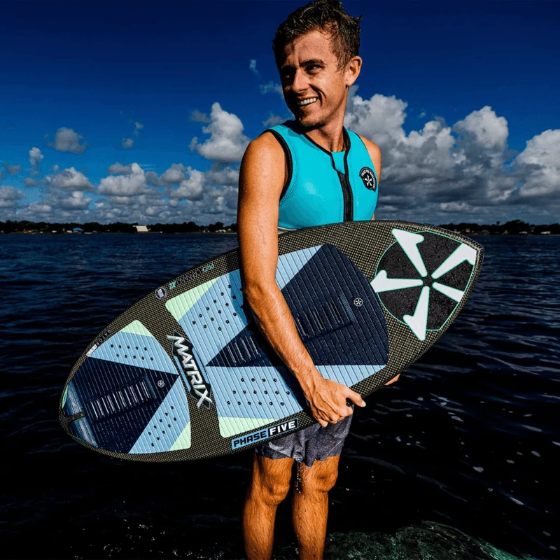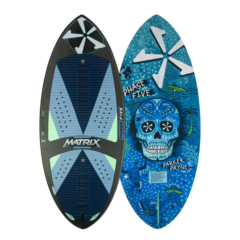 The Phase Five Matrix Wakesurfer is an advanced board delivering unrivaled performance. Adopted by many professional riders on the team, the Matrix is sealed and approved to meet the highest expectations. The Matrix is made with a thinner core and boxy rails for ultimate POP and responsiveness. The symmetrical outline rides incredibly well backwards while the subtle V-Spline bottom contours generate trick demanding speed and sensitivity. It includes an added carbon stringer for additional pop, and constructed with Phase 5’s super tough Gatorskin to take a beating. The Matrix is built with a single fin setup and loaded with the 1” Skim Fin. The Matrix Payne Pro features a unique bottom graphic that Parker Payne dreamed up. No specific design or construction features differentiate the Payne Pro from the Matrix.